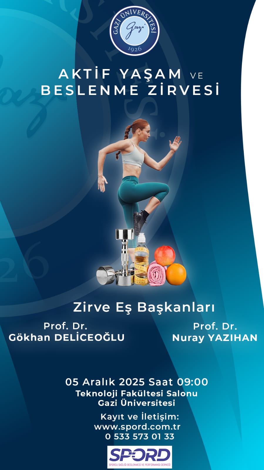 Gazi Üniversitesi Spor Bilimleri Fakültesi ve Sporcu Sağlığı, Beslenmesi ve Performansı Derneği (SPORD) iş birliğinde Gazi Üniversitesi Spor Bilimleri Fakültesi öğretim üyesi Prof. Dr. Gökhan Deliceoğlu ve Ankara Üniversitesi Tıp Fakültesi Öğretim Üyesi Prof. Dr. Nuray Yazıhan eş başkanlığında gerçekleştirilecek “Aktif Yaşam ve Beslenme Zirvesi”, 5 Aralık 2025 tarihinde Gazi Üniversitesi Teknoloji Fakültesi Konferans Salonu’nda yapılacaktır.