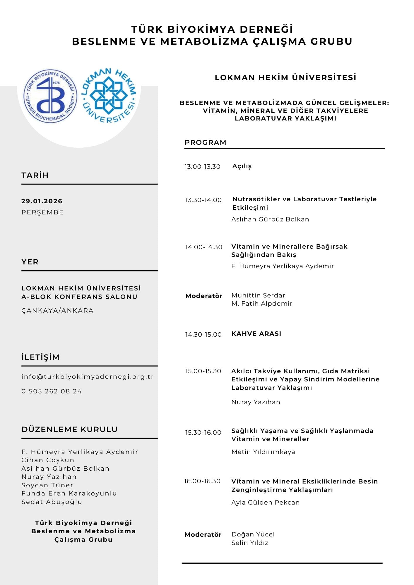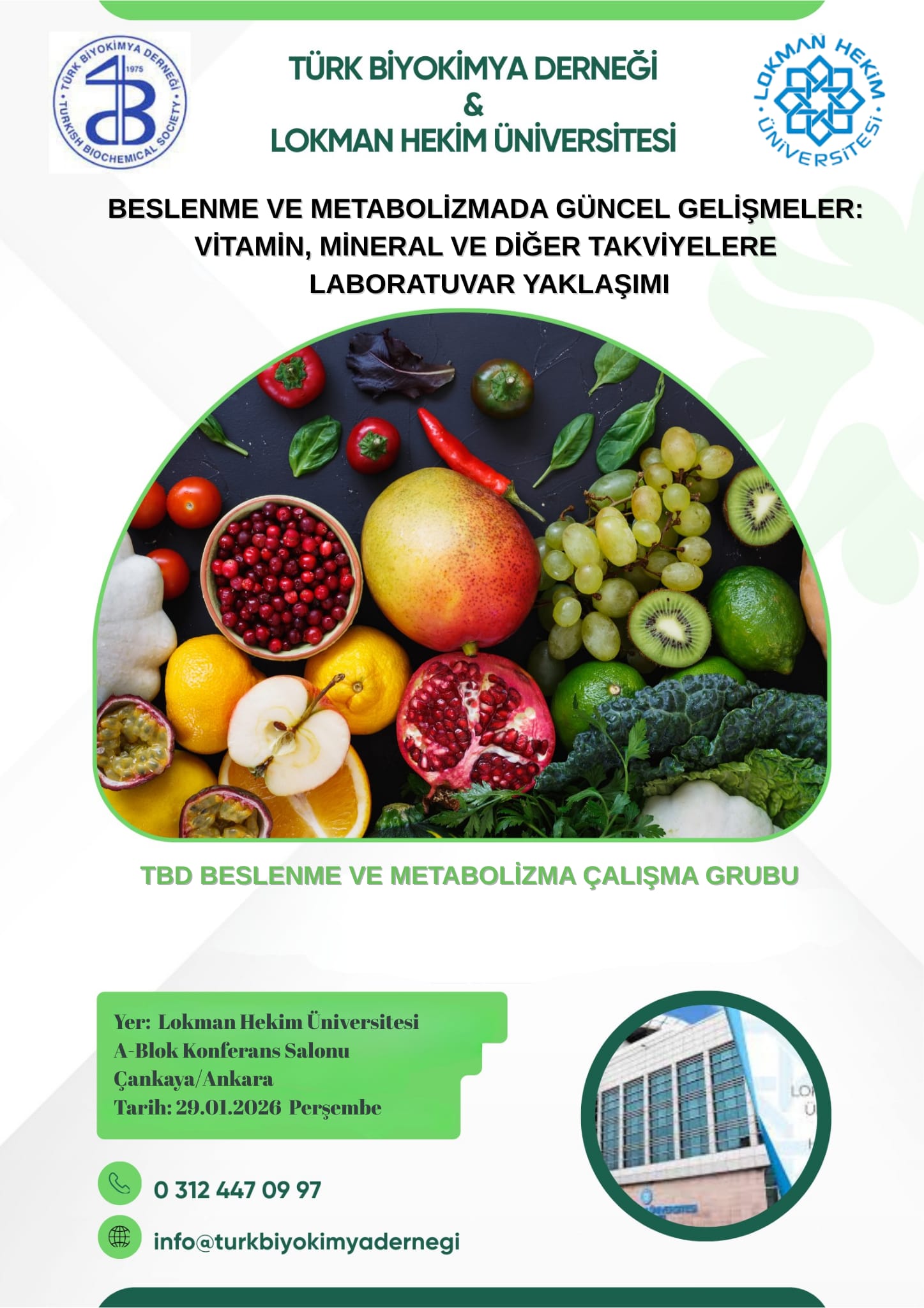Türk Biyokimya Derneği Beslenme ve Metabolizma Çalışma Grubu tarafından, 29 Ocak 2026 tarihinde Lokman Hekim Üniversitesi ev sahipliğinde Ankara'da düzenlenecek olan “Beslenme ve Metabolizmada Güncel Gelismeler: Vitamin, Mineral ve Diger Takviyelere Laboratuvar Yaklasimi” başlıklı bilimsel toplantımıza sizleri davet etmekten büyük mutluluk duyuyoruz.