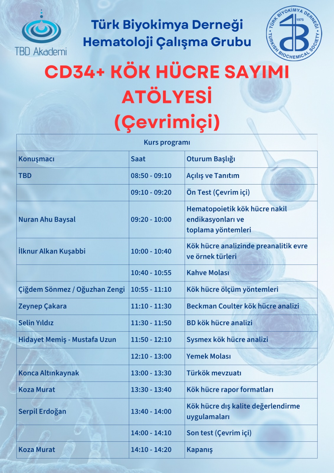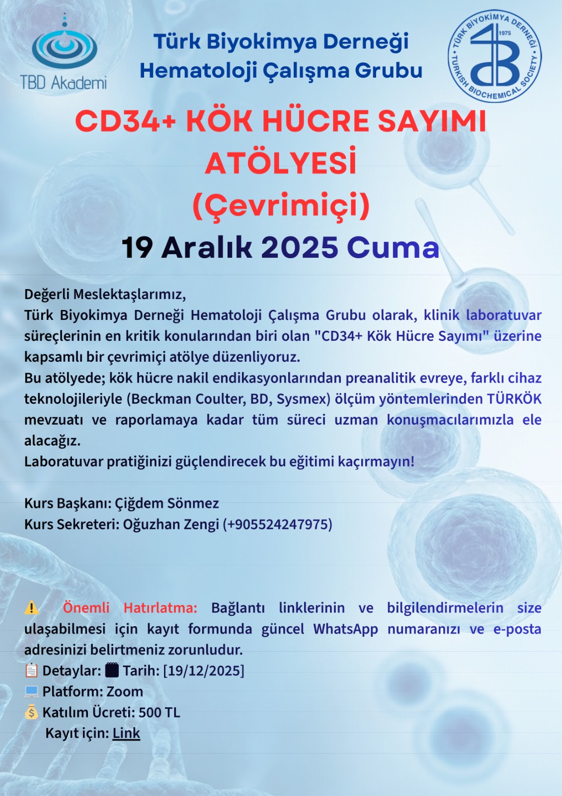 Türk Biyokimya Derneği Hematoloji Çalışma Grubu'nun, klinik laboratuvar süreçlerinin en kritik konularından biri olan "CD34+ Kök Hücre Sayımı" üzerine kapsamlı bir çevrimiçi atölye düzenliyor.